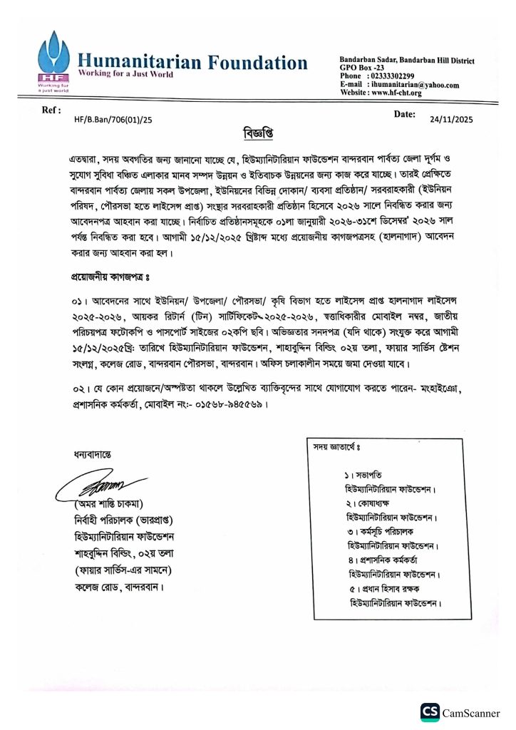 Dear bidders/vendors, Please note that all types of tenders (an invitation to bid for a project by HF) for a project by our organization are published on the website. All the tender applicants/vendors are kindly requested to regularly/timely check the tender notice on the website of the organization. Thank you all.